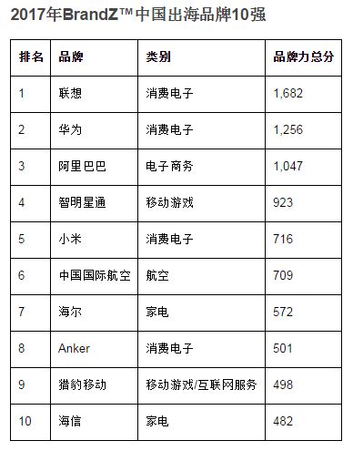 WPP和凱度華通明略聯(lián)手Google發(fā)布了首期“BrandZ中國出海品牌30強”排行榜及報告。聯(lián)想以1,682的品牌力得分一馬當先,成為最強大的中國出海品牌。緊隨其后的是,華為(1,256)以及阿里巴巴(1,047)。報告指出,消費者對中國產品的負面認知正在下降,互聯(lián)網驅動品牌潛力巨大,中國品牌行動速度往往快于西方品牌。(美通社,2017年1月10日北京)