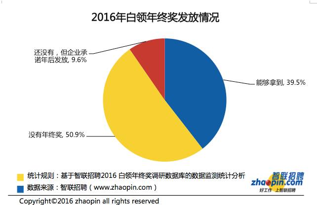 智聯(lián)招聘發(fā)布的《2016白領(lǐng)年終獎?wù){(diào)查》顯示,只有39.5%的白領(lǐng)表示可以拿到年終獎,明顯高于2015年13.4%的比例,另外有9.6%的白領(lǐng)表示企業(yè)承諾會在年后發(fā)放年終獎。調(diào)查顯示,2016年年終獎的總體均值為12821元,整體水平較2015年略有上升,但仍低于2014年的13613元。金融行業(yè)和國企白領(lǐng)的年終獎均值最高,為1.7萬元。地區(qū)上,北京的年終獎均值最高,為15846元,上海、深圳和杭州分列其后。(美通社,2017年1月12日北京)