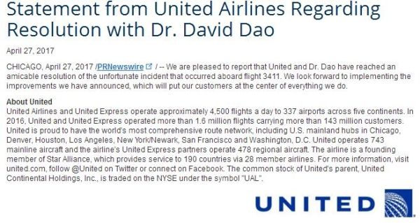 4月9日,美聯(lián)航將一位拒絕放棄座位的亞裔醫(yī)生David Dao暴力拖拽下機(jī),引發(fā)大范圍輿論抗議。27日,美聯(lián)航在通過美通社發(fā)布的一份聲明中表示,已經(jīng)與David Dao達(dá)成和解,但未透露具體金額。同天,美聯(lián)航宣布推出10項(xiàng)整改承諾,除非安全或保安受到威脅,不會(huì)要求已經(jīng)登機(jī)的乘客非自愿放棄其機(jī)位,且將提高自愿棄程賠償金的上限至一萬(wàn)美元。美聯(lián)航在聲明中稱,“我們期待在未來(lái)實(shí)施我們已經(jīng)宣布的改進(jìn)措施,這將使顧客成為我們一切努力的中心。”(美通社,2017年4月27日芝加哥)