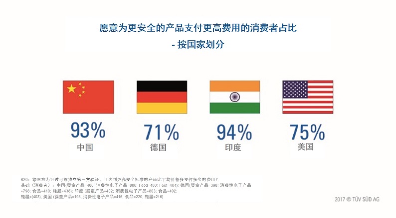 知名認(rèn)證機(jī)構(gòu)TUV南德意志集團(tuán)進(jìn)行了一項(xiàng)全球性的獨(dú)立研究,選取了中國(guó)、德國(guó)、印度和美國(guó)這四個(gè)國(guó)家的數(shù)個(gè)一線(xiàn)城市作為樣本,寫(xiě)成《TUV南德意志集團(tuán)消費(fèi)品安全報(bào)告》。報(bào)告顯示,中國(guó)消費(fèi)者對(duì)產(chǎn)品安全的關(guān)注程度不斷提升。在被調(diào)查的中國(guó)消費(fèi)者中有63%的人表示,產(chǎn)品安全現(xiàn)在對(duì)他們來(lái)說(shuō)非常重要,而且在2007年,這一比例僅為53%。中國(guó)企業(yè)對(duì)產(chǎn)品的安全意識(shí)也在四個(gè)受訪國(guó)中排名第一,從2012年的72%上升至年93%,其次分別是德國(guó)(201680%),印度(62%)及美國(guó)(62%)。在中國(guó),愿意為產(chǎn)品支付更高價(jià)格的消費(fèi)者的比例達(dá)到了93%,遠(yuǎn)超美國(guó)的75%和德國(guó)的71%。嬰童產(chǎn)品為消費(fèi)者愿意“花高價(jià),買(mǎi)安全”的產(chǎn)品。(美通社,2017年5月8日上海)