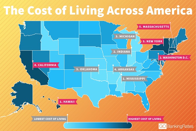 美國財經(jīng)網(wǎng)站GOBankingRates的一項(xiàng)調(diào)查顯示,美國生活成本最高的五個州分別是夏威夷州、哥倫比亞特區(qū)、紐約州、加州以及馬薩諸塞州,而生活成本最低的五個州則分別是密西西比州、印第安納州、密歇根州、阿肯薩斯州以及俄克拉荷馬州。這項(xiàng)排名是綜合比較各州房價、日用品、水電氣、交通、健康醫(yī)療以及各種雜項(xiàng)開支后得出的。值得一提的是,房價方面,華盛頓特區(qū)要比全美平均房價高出134%,成為美國房價最貴的地區(qū),加州緊隨其后,高出全國平均水平92.7%。(美通社,2017年5月11日洛杉磯)