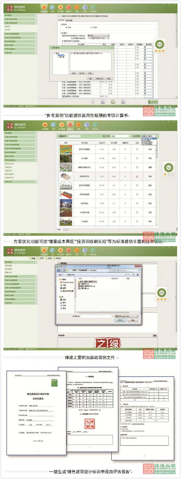 該軟件采用封閉式填選的方式快速完成綠色建筑相關(guān)指標(biāo)的錄入,自動完成條文達(dá)標(biāo)及得分判定、智能得分統(tǒng)計、項目達(dá)標(biāo)判斷。同時可將評價結(jié)果通過導(dǎo)出到word、等文檔處理軟件生成綠色建筑自評估報告。豐富的綠色建筑專項計算工具,使設(shè)計師可以通過簡單的指標(biāo)錄入,自動生成專項計算報告及滿足地方報審格式的報告書。自2016年7月正式推出1.0版后,根據(jù)市場真實需求進行了數(shù)次升級,達(dá)到了最人性化、最智能、最專業(yè)的功能設(shè)計要求,目前市場最為需要的綠建預(yù)評估、方案優(yōu)化及方案對比、增量成本分析、綠建設(shè)計、綠色建材選用都完美實現(xiàn),軟件已經(jīng)獲得中國建筑設(shè)計研究院、北京市建筑設(shè)計研究院有限公司、中國建筑標(biāo)準(zhǔn)設(shè)計研究院等200多家大院采購并應(yīng)用。