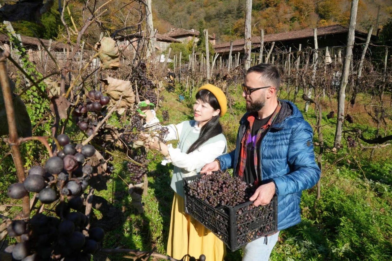 Driving to the Ajarian Wine House on the outskirts of Batumi, Chinese travelers got baskets and scissors for the day's grape-picking. Besides picking, there was a special activity in the vineyard - singing to the grapes. It's said this helps grapes stay happy, making better wine. There, they sang cheerful songs with locals under the sun, facing the grapevines. After picking, they visited the cellar to learn about the grape-to-wine process. The locals patiently explained each step from fermentation to bottling, full of craftsmanship and enthusiasm.