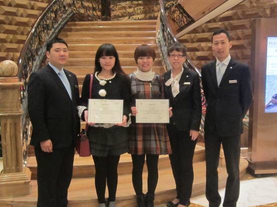 圖為學(xué)生獲得西安賽瑞喜來登大酒店實(shí)習(xí)證書 人力資源總監(jiān)李凱(左一)、人力資源部副經(jīng)理袁俊梅(右二)、培訓(xùn)經(jīng)理石旭東(右一)、濟(jì)南大學(xué)酒店管理學(xué)院酒店管理2011級(jí)學(xué)生史悅悅(左三)、濟(jì)南大學(xué)管理學(xué)院財(cái)務(wù)會(huì)計(jì)專業(yè)2011級(jí)學(xué)生邢楚若(左二)