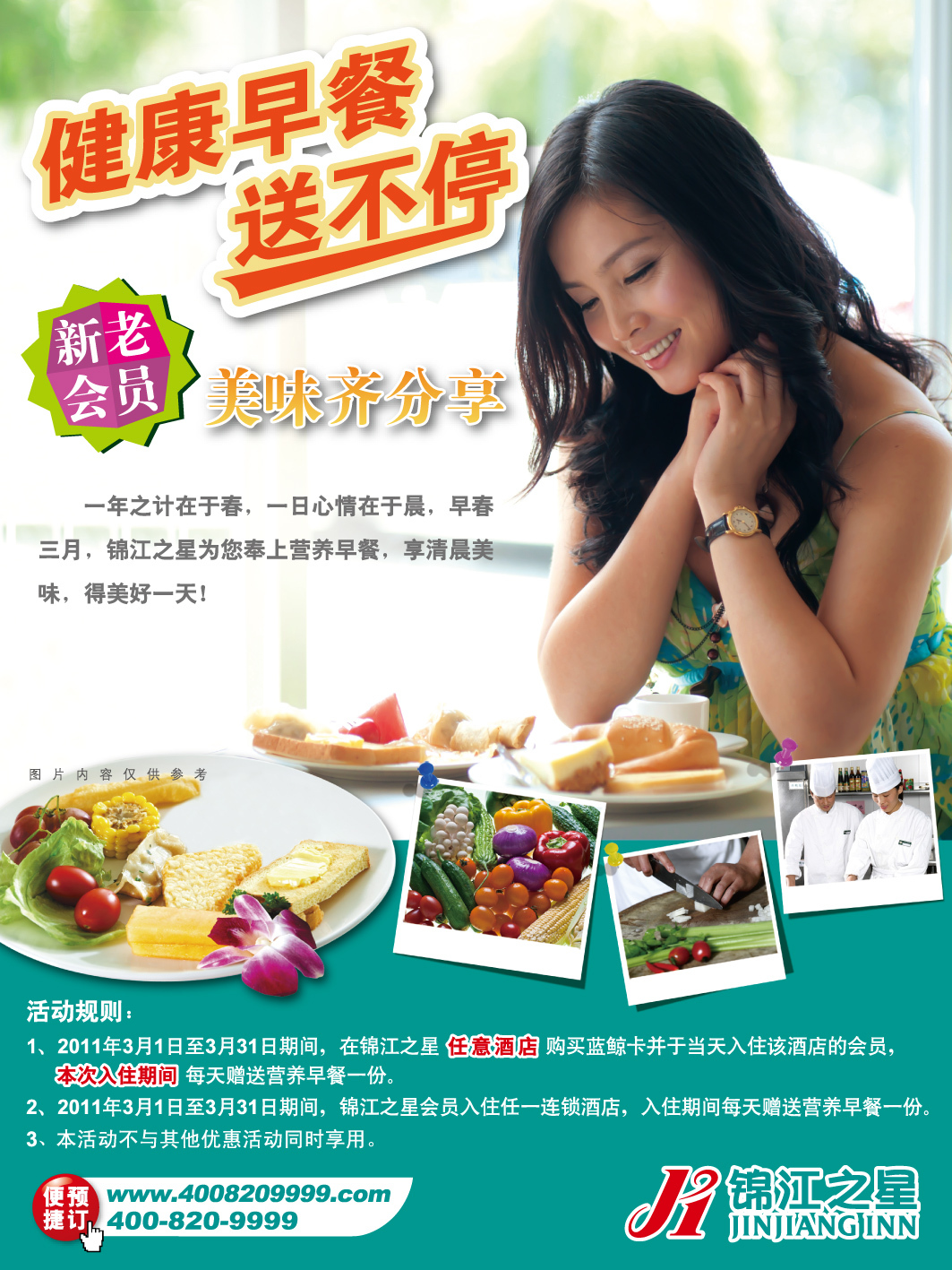 此次為了回饋廣大新老會(huì)員,繼“千萬獎(jiǎng)品別錯(cuò)過(第二季)”春節(jié)特惠活動(dòng)之后,錦江之星將于2011年3月開展“健康早餐送不停,新老會(huì)員齊分享”主題優(yōu)惠活動(dòng),為會(huì)員送上超值大禮,同時(shí)也是對廣大會(huì)員真誠關(guān)懷的體現(xiàn)。