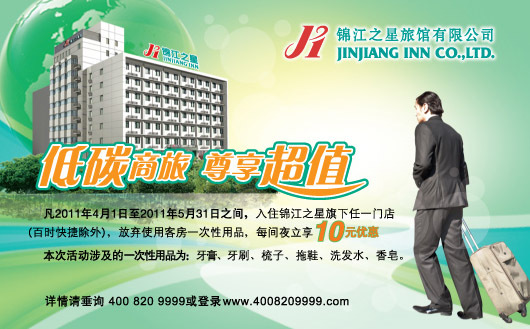 上海2011年3月15日電 /美通社亞洲/ -- 錦江之星將于2011年4月1日起在全國范圍內(nèi)開展“低碳商旅,尊享超值”的環(huán)保主題活動。