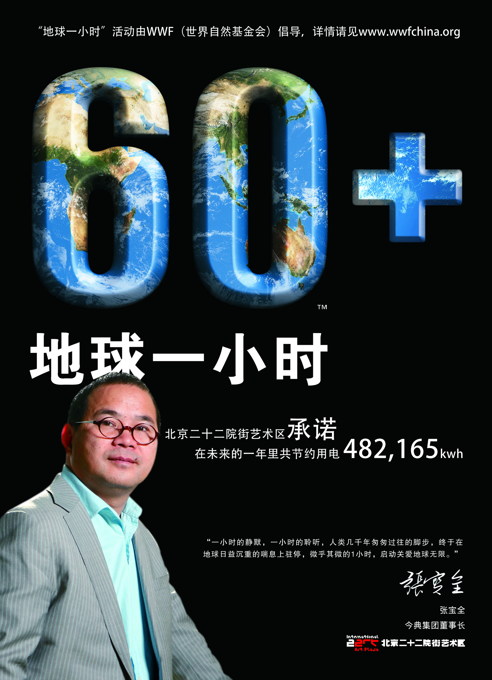 二十二院街藝術(shù)區(qū)投資方今典集團(tuán)的董事長張寶全倡議:“一小時的靜默,一小時的聆聽,人類幾千年匆匆過往的腳步,終于在地球日益沉重的喘息上駐停,微乎其微的一小時,卻啟動了更多人心中對地球這個大家園的無限關(guān)愛。”