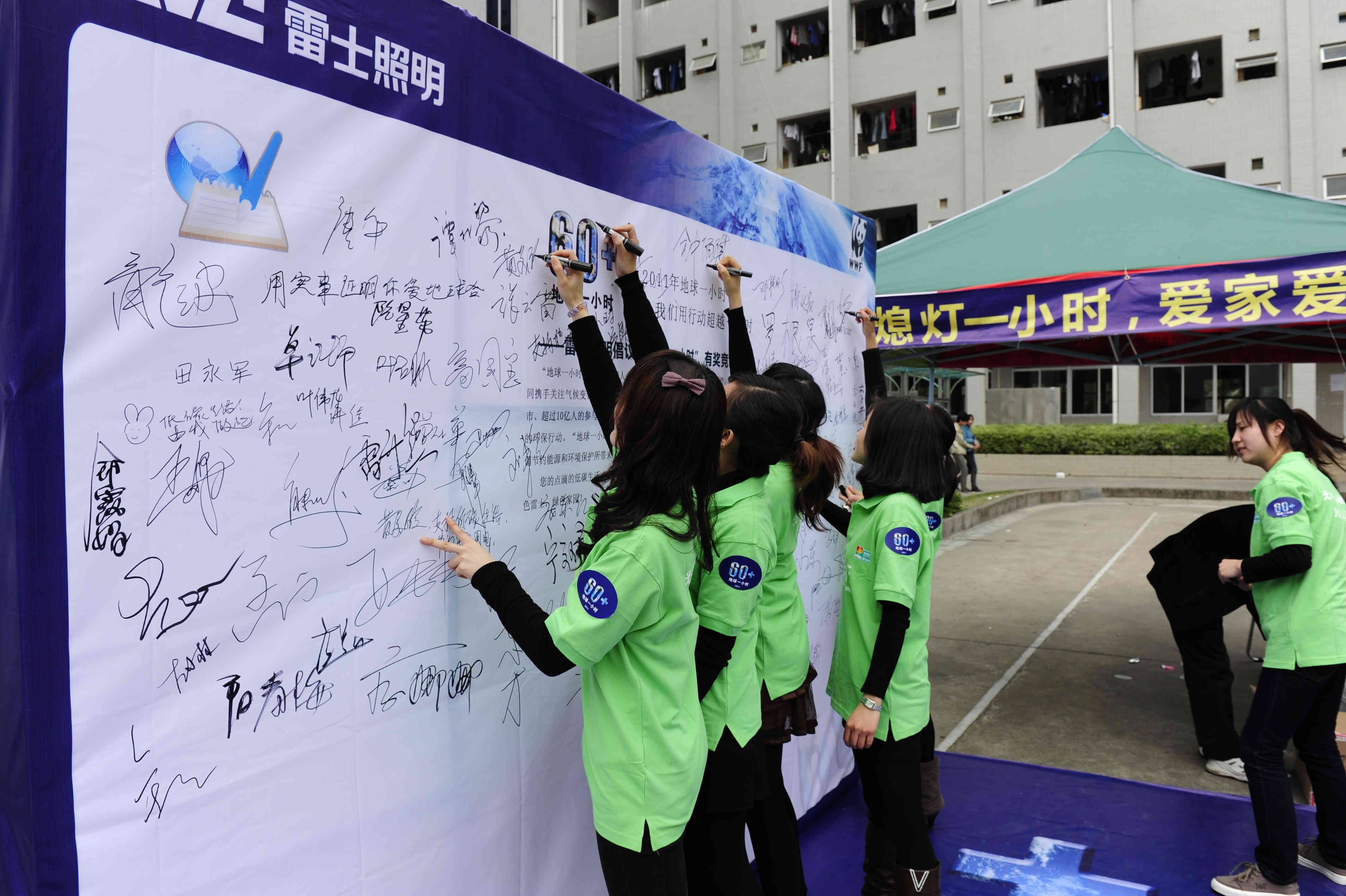 今年的主題是“熄燈一小時(shí),世界將因你而改變”。記者在惠州雷士工業(yè)園發(fā)現(xiàn),“熄燈一小時(shí),愛(ài)家愛(ài)地球”、“雷士照明,碳減排先峰”、“為地球熄燈一小時(shí)”等等橫幅掛在園區(qū)顯要位置,當(dāng)天晚上20點(diǎn)30分一到,在園區(qū)工員工們的見(jiàn)證下,幾幢宿舍樓、辦公大樓等一齊熄燈。隨后,雷士的員工們?cè)趶V場(chǎng)點(diǎn)起蠟燭,排起一個(gè)大大的心型和“60+”的火燭圖標(biāo),表達(dá)了對(duì)“地球一小時(shí)”活動(dòng)的支持和行動(dòng),員工們同時(shí)還分組探討“如何在生活中推行環(huán)保”、“大家暢談各自的環(huán)保承諾”等議題,活動(dòng)氣氛熱烈。