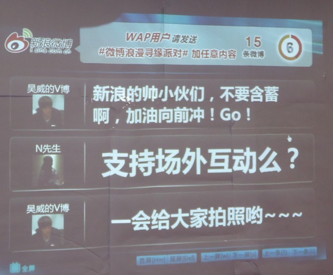 活動(dòng)地點(diǎn)位于朝陽門內(nèi)大街京城繁華地段的東單明珠。和煦的陽光、溫暖的春風(fēng)首先為這場大企業(yè)聯(lián)誼派對(duì)送上了一個(gè)明媚的好天氣。活動(dòng)現(xiàn)場更布置了新浪微博大屏幕,為現(xiàn)場微博互動(dòng)做足了準(zhǔn)備。活動(dòng)從破冰游戲“武松打虎”開始,讓珍愛網(wǎng)的優(yōu)質(zhì)男女與新浪微博熱情的員工迅速打破陌生的尷尬,進(jìn)入狀態(tài),全身心投入這場甜蜜熱烈的年輕人歡聚的派對(duì)中。
