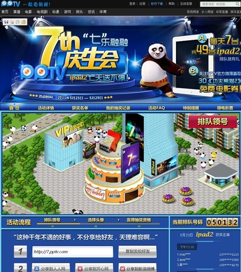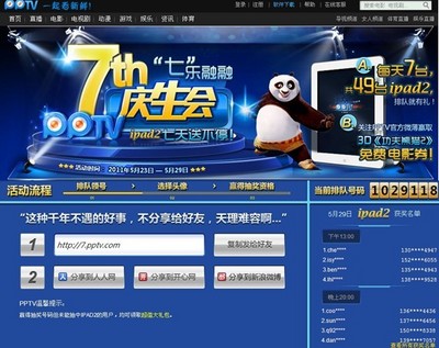 上海2011年5月24日電 /美通社亞洲/ -- 2011年5月23日零點(diǎn),為感謝眾多忠實(shí)擁護(hù)者7年來(lái)的陪伴,PPTV 網(wǎng)絡(luò)電視七周年慶生送 iPad2 系列活動(dòng)正式開(kāi)始。截止活動(dòng)第一天抽獎(jiǎng)結(jié)束,PPTV 網(wǎng)絡(luò)電視7周年活動(dòng)頁(yè)面用戶排隊(duì)次數(shù)已突破5萬(wàn),7臺(tái) iPad2 大獎(jiǎng)以及第一批的 3D《功夫熊貓2》電影券均發(fā)至用戶手中,目前該活動(dòng)仍在火爆進(jìn)行中。(活動(dòng)網(wǎng)站:http://7.pptv.com)