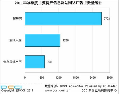 DCCI Admonitor 2011年第二季度網(wǎng)絡(luò)廣告投放監(jiān)測(cè)數(shù)據(jù)顯示,搜房網(wǎng)、新浪樂居和焦點(diǎn)房地產(chǎn)網(wǎng)是廣告主集中投放的專業(yè)房產(chǎn)網(wǎng)站,搜房網(wǎng)以3176家廣告主的數(shù)量繼續(xù)占據(jù)首位,領(lǐng)先于其他房產(chǎn)網(wǎng)站廣告主的數(shù)量,搜房網(wǎng)的廣告主數(shù)量在整個(gè)房產(chǎn)網(wǎng)站廣告主數(shù)量的占比超過50%。