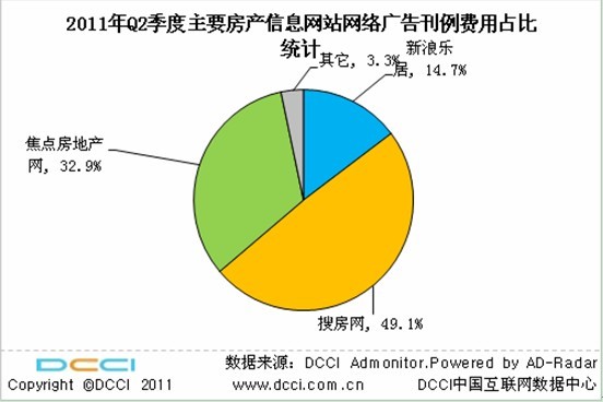 DCCI Admonitor 2011年第二季度網(wǎng)絡(luò)廣告投放監(jiān)測(cè)數(shù)據(jù)顯示,2011年第二季度專業(yè)房產(chǎn)信息網(wǎng)站的刊例費(fèi)大都出現(xiàn)了上漲,其中搜房網(wǎng)的刊例費(fèi)位居第一,其營(yíng)收規(guī)模突破億元大關(guān),達(dá)到1.23億元,焦點(diǎn)房地產(chǎn)網(wǎng)和新浪樂居位列二、三位;搜房網(wǎng)在房產(chǎn)信息服務(wù)網(wǎng)站網(wǎng)絡(luò)廣告總刊例費(fèi)用比例接近50%,遙遙領(lǐng)先其它網(wǎng)站。2011年第二季度房產(chǎn)信息網(wǎng)站的廣告投放規(guī)模出現(xiàn)了明顯的回暖與增長(zhǎng)。