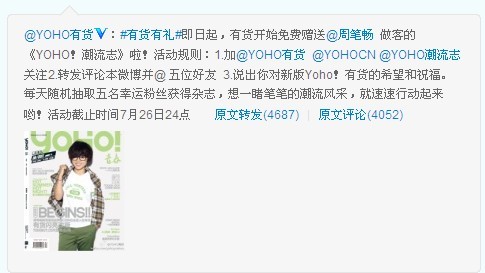 為了慶祝和宣傳 Begins 入駐 Yoho!有貨,早在7月20日,Yoho!有貨官方微博暨發(fā)起了轉(zhuǎn)發(fā)“Begins 入駐 Yoho!有貨,贈(zèng)送周筆暢封面雜志《Yoho!潮流志》“活動(dòng)。截止到今天共有4600多條轉(zhuǎn)發(fā),4000余條評論,加上此前發(fā)布的 Begins 正式入駐 Yoho!有貨新聞消息,共有5萬余人參與了微博的轉(zhuǎn)發(fā),評論量更是達(dá)到了3萬余條。沒想到粉絲們的力量是如此強(qiáng)大,正是借助于微博傳播,在周筆暢、Begins、Yoho 的貼吧粉絲們也是自覺將 Begins 的最新消息與其他筆迷們分享。