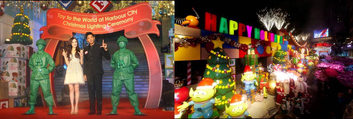 海港城與香港迪士尼樂(lè)園將一同活出想象,把海港城海運(yùn)大廈露天廣場(chǎng)幻化成以“玩具總動(dòng)員”為主題的圣誕布置,4米高的“胡迪”、3米高的“翠絲”及“抱抱龍”置于50米長(zhǎng)色彩繽紛的巨型積木之中,與“綠色小人”、“紅心”、豬仔錢罌“火腿”、“彈弓狗”和“玩具兵團(tuán)”跟大家一同歡度非一般的反斗圣誕。海港城于2011年11月8日在海港城海運(yùn)大廈露天廣場(chǎng)舉行《反斗圣誕總動(dòng)員@海港城》圣誕亮燈儀式,請(qǐng)來(lái)著名藝人夫婦陳建州(黑人)及范瑋琪(范范)作亮燈嘉賓,他們亦是首對(duì)以夫妻檔形式擔(dān)任這個(gè)全城期待的圣誕亮燈儀式的嘉賓,這也是他倆新婚燕爾的第一個(gè)圣誕來(lái)到香港度過(guò)這個(gè)浪漫佳節(jié),為歡欣圣誕展開序幕。