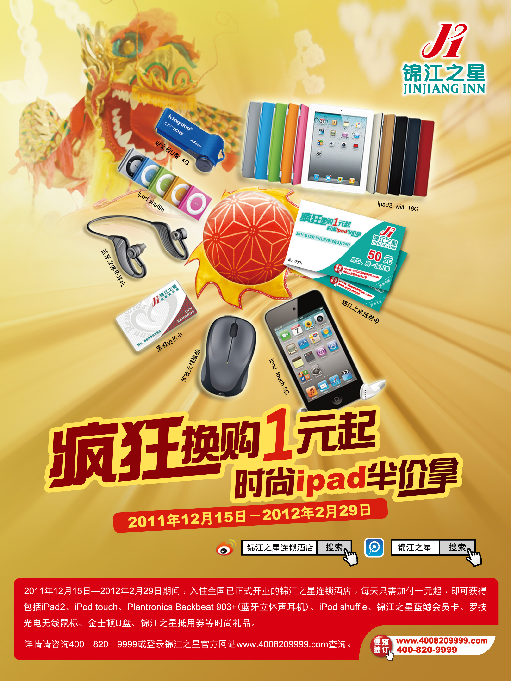 上海2011年12月6日電 /美通社亞洲/ -- 在連續(xù)兩年推出“千萬(wàn)獎(jiǎng)品別錯(cuò)過(guò)”活動(dòng)引爆春節(jié)市場(chǎng)后,錦江之星將于2012年春節(jié)期間再掀優(yōu)惠風(fēng)暴。從2011年12月15日起,至2012年2月29日,錦江之星將推出“瘋狂換購(gòu)1元起,時(shí)尚iPad半價(jià)拿”主題優(yōu)惠活動(dòng),錦江之星體驗(yàn)券、藍(lán)鯨會(huì)員卡和眾多時(shí)尚數(shù)碼獎(jiǎng)品,只要1元起,即可超值換購(gòu)。