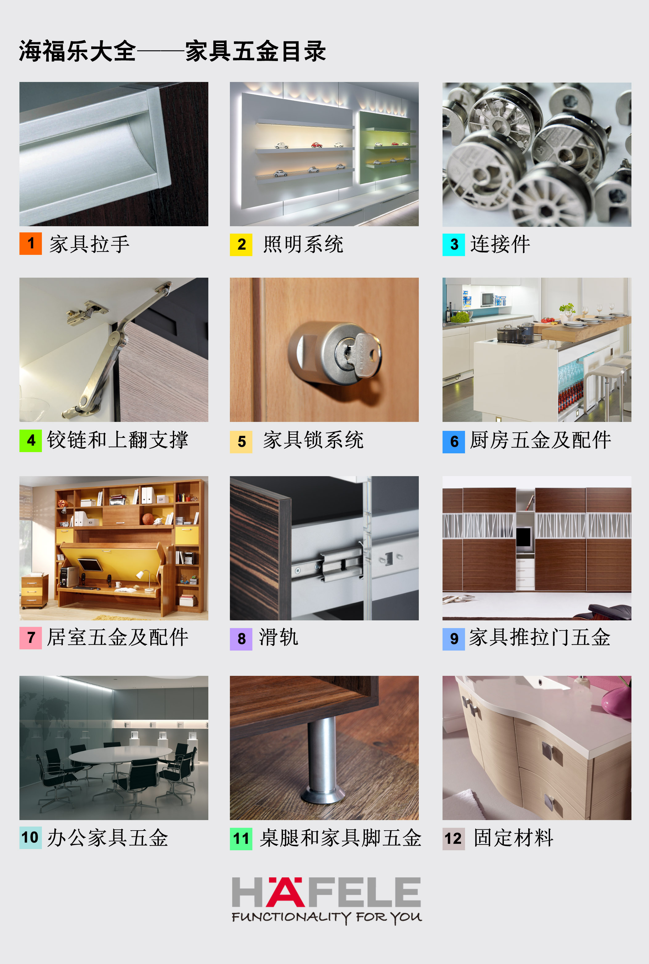 作為全球第一家提出五金“功能性”理念的企業(yè),海福樂不斷調(diào)整其產(chǎn)品種類,為采購人員和室內(nèi)設(shè)計師提供解決方案和設(shè)計靈感。此次,海福樂針對中國市場,在600多頁的產(chǎn)品手冊中收納產(chǎn)品3000余種,涵蓋了家具及家居中的方方面面,如家具拉手、照明系統(tǒng)、連接件、鉸鏈和翻門支撐、家具鎖系統(tǒng)、廚房五金及配件、居室五金及配件、滑軌、家具推拉門五金、辦公家具五金、桌腿和家具腳五金以及固定材料(PVC、螺釘和膠粘劑)。