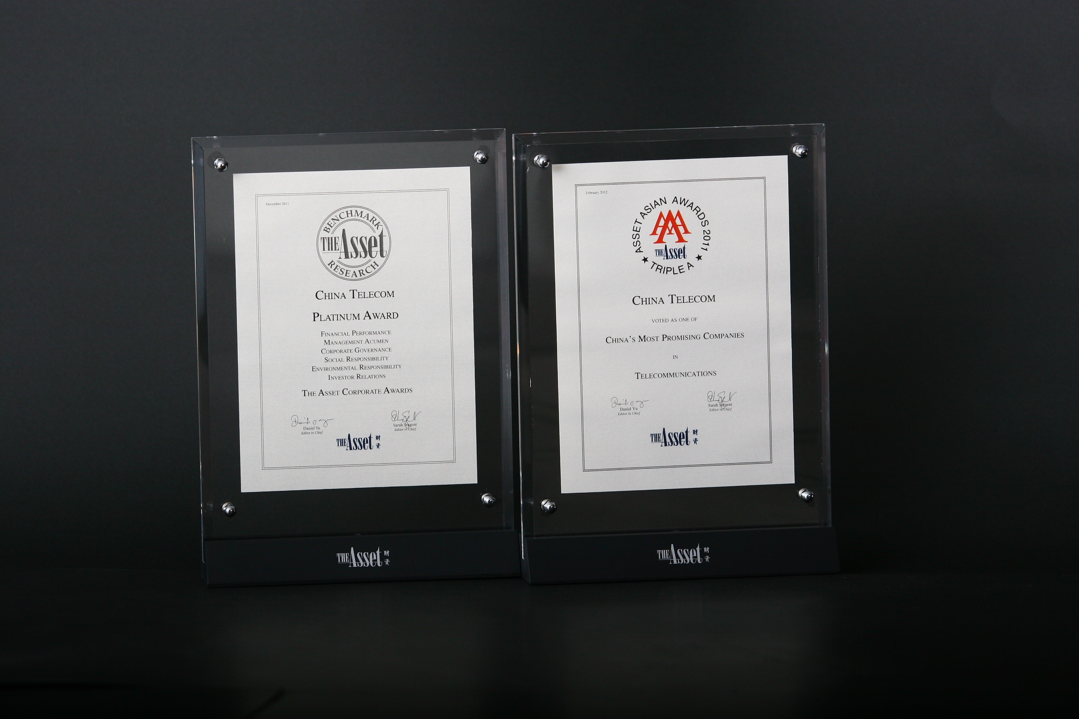 此外,在亞洲著名財經(jīng)雜志《The Asset》的“2011年企業(yè)大獎”及“最具潛力中國企業(yè)”評選中,中國電信獲得兩項大獎: