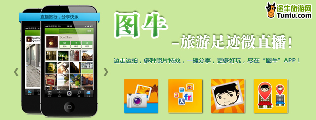 “圖牛”手機客戶端的誕生,將途牛旅游網“途牛社區(qū)”分享功能拓展到了移動互聯網。截至2012年3月中旬,途牛社區(qū)總計整合了近10萬篇旅游攻略,通過途牛出游的旅游達人在途牛社區(qū)總計發(fā)表游記超過4000篇。旅游攻略和游記的足跡,踏遍了全球的每一個引人入勝的角落。新近誕生的“圖牛”APP,除可即時拍照圖片上傳和分享游記,更自帶了LOMO、X-Pro、炫彩、老照片等十余種濾鏡,輕松玩轉圖片美化效果。一鍵分享功能,讓你的微博、flickr、人人網等好友能實時分享美景;“圖牛”更能設置拍照地點坐標信息,并可查看周圍的用戶和景點圖片,讓旅游分享隨心所欲。