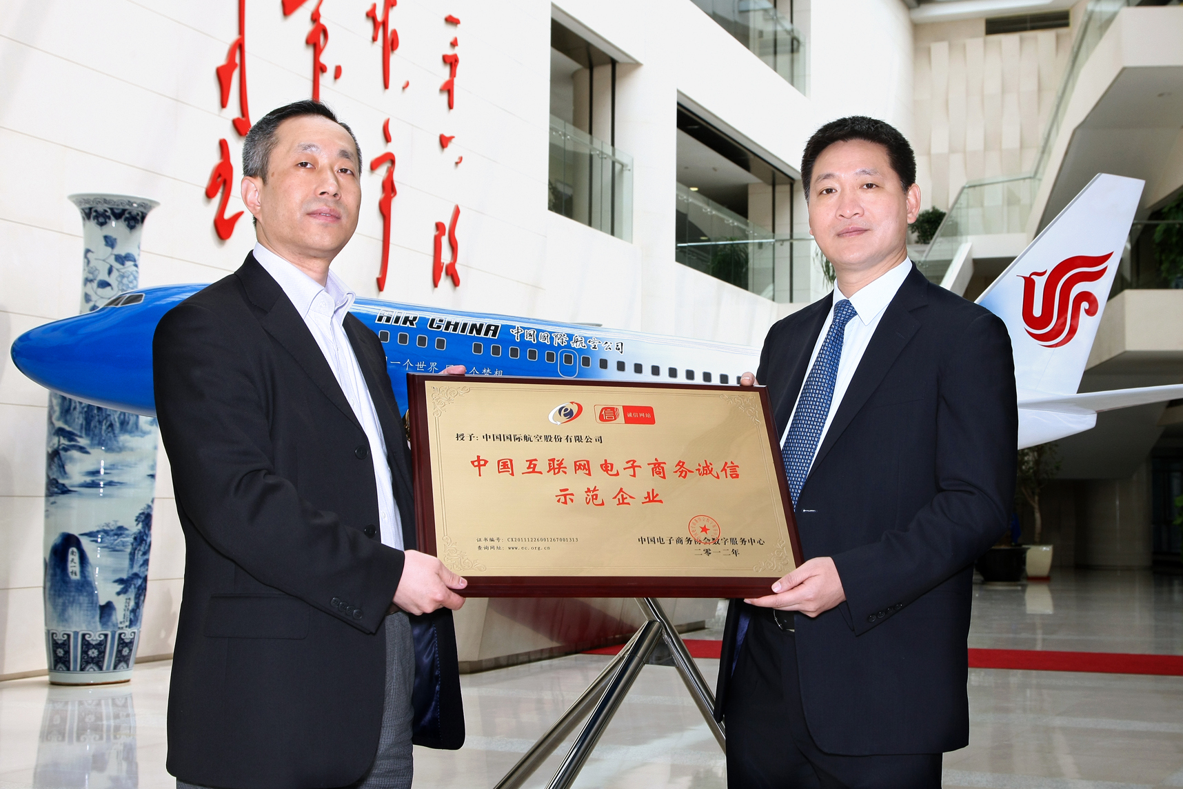北京2012年5月8日電 /美通社亞洲/ -- 近日,中國(guó)國(guó)際航空股份有限公司(以下簡(jiǎn)稱:國(guó)航)副總裁王明遠(yuǎn)在國(guó)航總部接見(jiàn)中國(guó)電子商務(wù)協(xié)會(huì)副秘書(shū)長(zhǎng)萬(wàn)東輝先生一行,并接受中國(guó)電子商務(wù)協(xié)會(huì)為國(guó)航頒發(fā)的“中國(guó)互聯(lián)網(wǎng)電子商務(wù)誠(chéng)信示范企業(yè)”榮譽(yù)牌匾。國(guó)航商委領(lǐng)導(dǎo)及部門(mén)負(fù)責(zé)人到場(chǎng)見(jiàn)證了這一光榮歷史時(shí)刻。