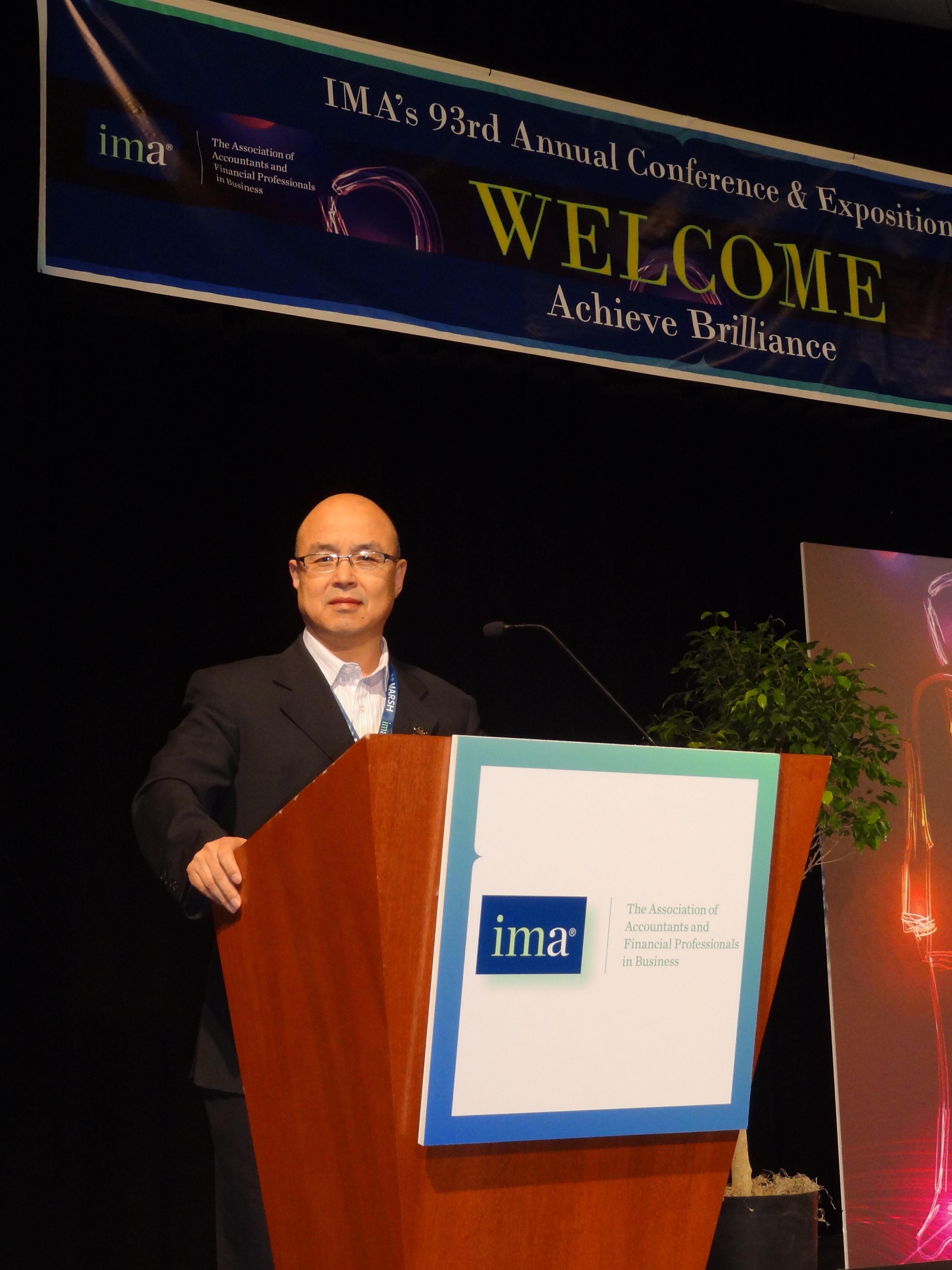 原國家外國專家局培訓(xùn)中心副主任(現(xiàn)任中國國際人才交流協(xié)會駐紐約辦事處總代表)鄭杰出席頒獎儀式并致辭,IMA董事會主席Brian McGuire博士和IMA總裁兼首席執(zhí)行官Jeff Thomson為其頒發(fā)獎杯。