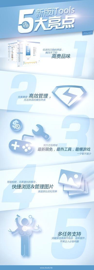 深圳2012年7月26日電 /美通社亞洲/ -- 由創(chuàng)想天空所開發(fā)的 iTools 新版于7月25日正式發(fā)布,為移動互聯(lián)網(wǎng)行業(yè)注入一劑強(qiáng)心劑。iTools 是一個(gè)蘋果輔助管理軟件。有別于其他類似的軟件,iTools 讓蘋果用戶盡管在沒有越獄的情況下,也可以非常方便的完成對蘋果設(shè)備的信息、音樂、鈴聲、電子書、圖片、桌面、軟件安裝、互聯(lián)網(wǎng)資源下載、系統(tǒng)信息的修改等工作,充分的滿足用戶的各種需求。