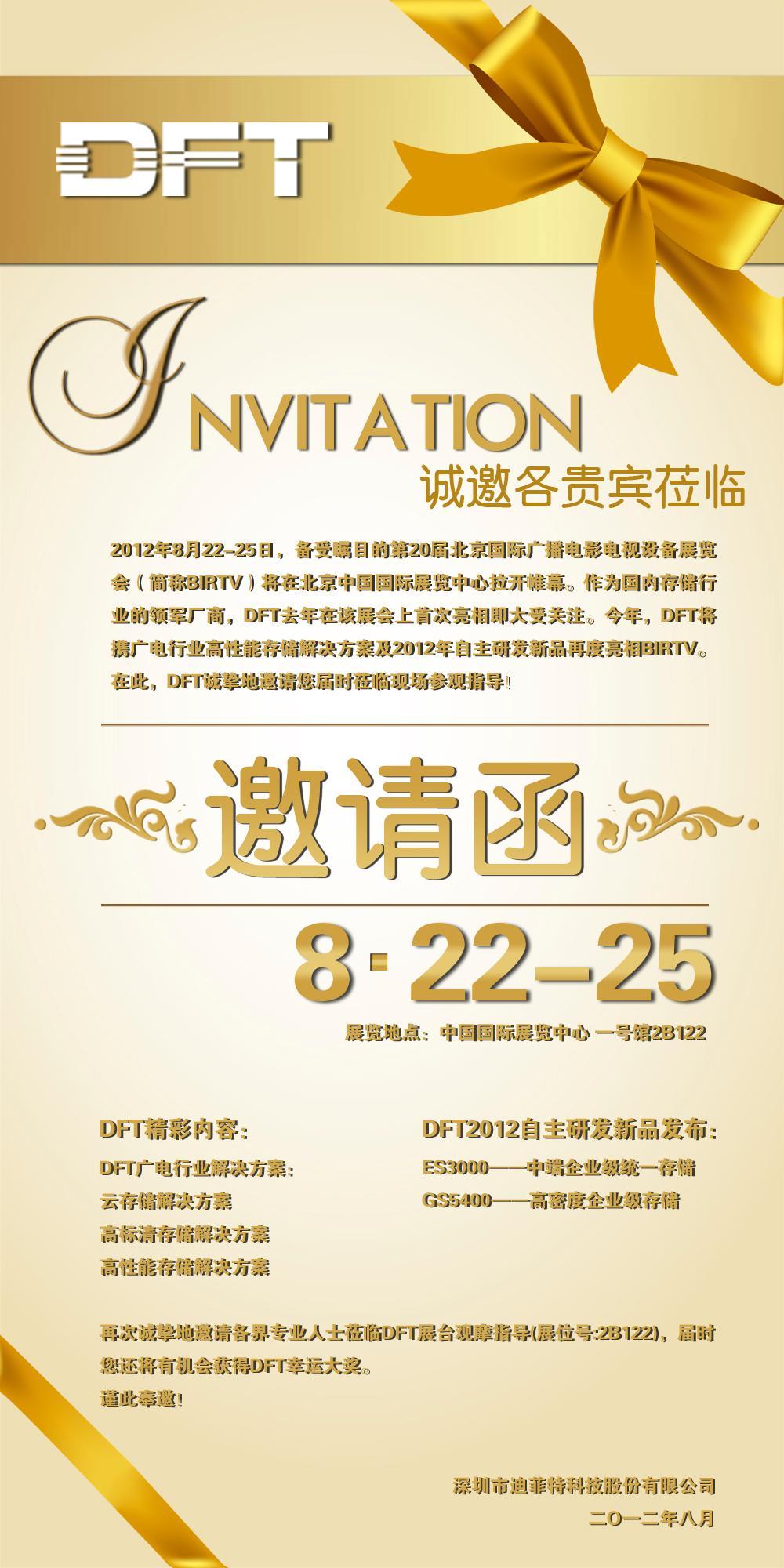 深圳2012年8月20日電 /美通社亞洲/ -- 2012年8月22-25日,備受矚目的第20屆北京國(guó)際廣播電影電視設(shè)備展覽會(huì)(簡(jiǎn)稱BIRTV)將在北京中國(guó)國(guó)際展覽中心拉開帷幕。作為國(guó)內(nèi)存儲(chǔ)行業(yè)的領(lǐng)軍廠商,DFT去年在該展會(huì)上首次亮相即大受關(guān)注。今年,DFT將攜廣電行業(yè)高性能存儲(chǔ)解決方案及2012年自主研發(fā)新品再度亮相BIRTV。在此,DFT誠(chéng)摯地邀請(qǐng)您屆時(shí)蒞臨現(xiàn)場(chǎng)參觀指導(dǎo)!