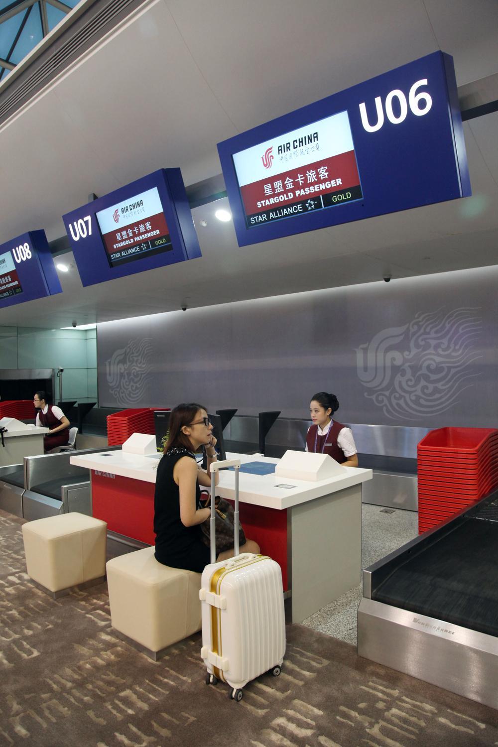 在成都雙流國(guó)際機(jī)場(chǎng)二號(hào)航站樓,國(guó)航可利用的專屬資源有了大幅提升,最明顯的是專屬值機(jī)柜臺(tái)由23個(gè)增長(zhǎng)至60個(gè),值機(jī)柜臺(tái)的增加將有效減少旅客排隊(duì)等候的現(xiàn)象,緩解客流高峰,改善旅客的出行體驗(yàn)。二號(hào)航站樓一共設(shè)置了28條安檢通道,其中16條是面向國(guó)航旅客的專屬通道,安檢通道數(shù)量的增加將有效地緩解高峰期旅客安檢排隊(duì)的情況,節(jié)省旅客的等候時(shí)間。同時(shí),16條國(guó)航專屬安檢通道距離值機(jī)島和停機(jī)位的距離都非常短,旅客們?cè)谵k理完乘機(jī)手續(xù)之后只需步行很短的距離便可到達(dá)安檢通道,而通過(guò)安檢后,更可直接面對(duì)近機(jī)位登機(jī)口,即便是遠(yuǎn)機(jī)位也遠(yuǎn)比一號(hào)航站樓近得多,免去了旅客在乘機(jī)過(guò)程中長(zhǎng)途步行的麻煩。
