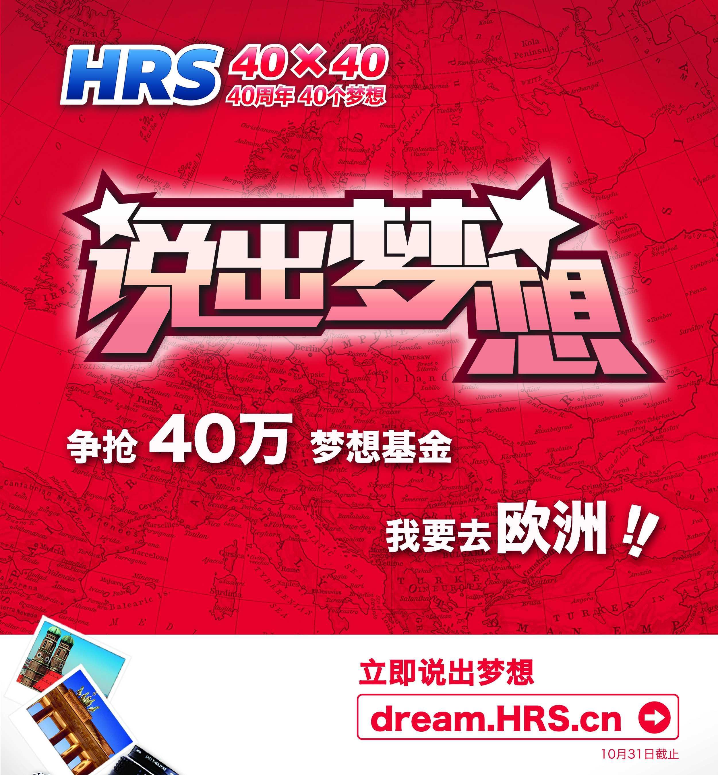 上海和德國科隆2012年9月4日電 /美通社/ -- 你是否曾夢想著能到歐洲旅游,卻因?qū)Ξ?dāng)?shù)匚幕⒄Z言和生活習(xí)慣等的不了解,而猶豫不決?或者因時間上的安排等種種因素,而沒能成行?你是否正計劃著要去參觀法國的農(nóng)莊,體驗一下梵高住過的酒店,或泡一泡德國的溫泉,來一次浪漫、愜意的歐洲之旅?為了鼓勵更多的國人行動起來,實現(xiàn)自己的旅游夢想,2012年9月1日,全球領(lǐng)先的在線旅游服務(wù)供應(yīng)商 -- HRS全球訂房網(wǎng),將啟動“40周年 40個夢想”的大型圓夢行動,讓你夢想成真。