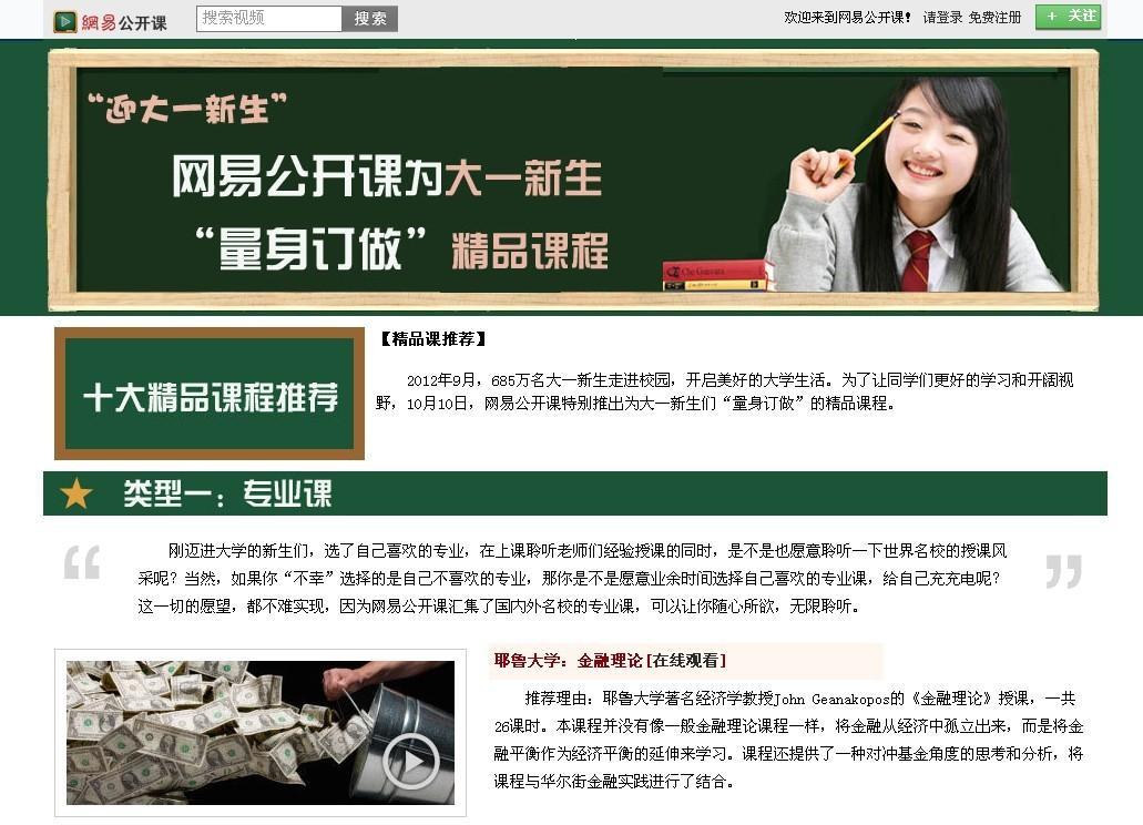 10月11日,網(wǎng)易公開課針對大一新生,特別推出了以上“量身訂做”的精品課程。該課程涵蓋專業(yè)課、基礎(chǔ)課、公共課、興趣課四大部分,多方面的給大一新生提供學(xué)習(xí)和生活支持。網(wǎng)易公開課相關(guān)負(fù)責(zé)人表示:“網(wǎng)易公開課現(xiàn)有幾十所國際國內(nèi)大學(xué)的課程、TED演講以及可汗學(xué)院,以后還會增加更多優(yōu)秀課程,努力打造成網(wǎng)上綜合大學(xué)。”