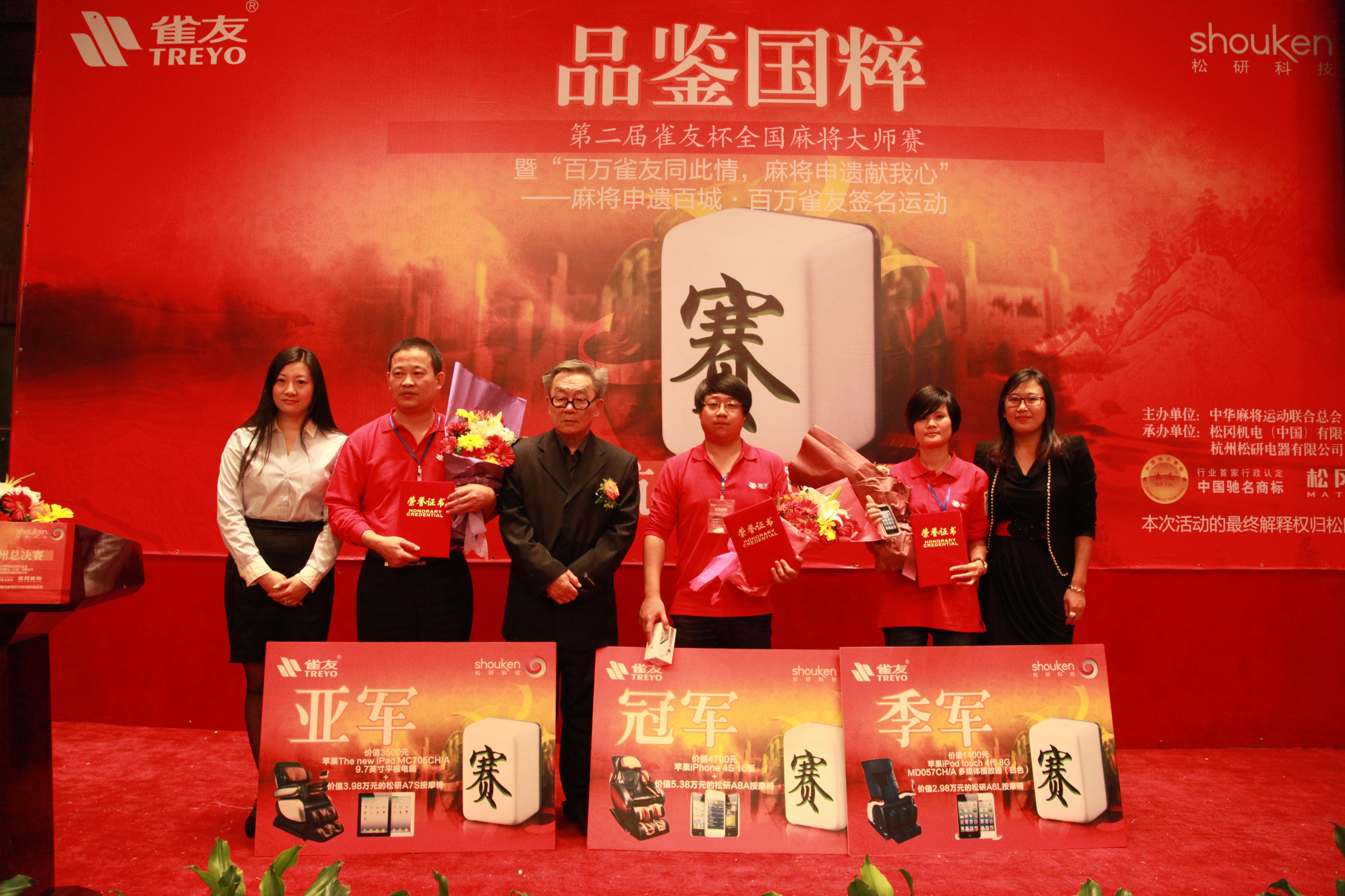 杭州2012年10月29日電 /美通社/ -- 10月27日,品鑒國粹第二屆雀友杯全國麻將大師賽總決賽在杭州眾安假日酒店圓滿落幕。中華麻將運動聯(lián)合總會會長盛琦,松岡機電(中國)有限公司董事長魏國華、常務(wù)副總經(jīng)理鄭忠良、營銷中心副總經(jīng)理何亦男、營運中心副總經(jīng)理潘林、營運中心總監(jiān)傅亦明以及杭州松研電器有限公司大客戶總監(jiān)于雪梅等攜42位來自全國21個分賽區(qū)的冠亞軍麻將大師出席大賽。本屆賽事仍由中華麻將運動聯(lián)合總會主辦,由目前全球較大的自動麻將機生產(chǎn)基地之 -- 松岡機電(中國)有限公司承辦,并獲得按摩椅產(chǎn)業(yè)領(lǐng)先者杭州松研電器有限公司的全程贊助。