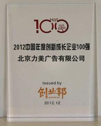 北京2012年12月10日電 /美通社/ -- 近日,由創(chuàng)業(yè)邦 (cyzone.cn) 主辦的“2012創(chuàng)業(yè)邦年會暨‘創(chuàng)業(yè)邦100’年度頒獎典禮”在北京千禧大酒店隆重舉行。本屆年會以“夢想照亮現(xiàn)實”為主題。經過激烈的角逐與多方評估、審核,國內領先的移動營銷解決方案提供商 -- 力美廣告?zhèn)髅?/a>,憑借其創(chuàng)新且領先的綜合實力,喜獲“創(chuàng)新成長企業(yè)100強”稱號。