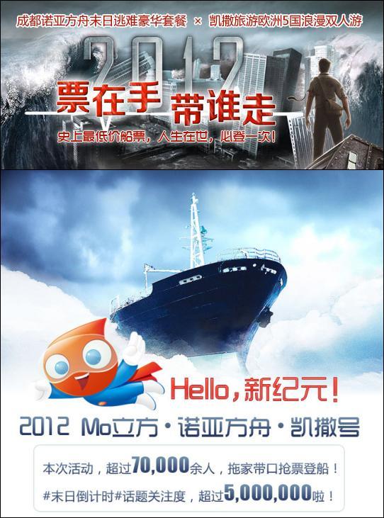 2012年12月17日,末日倒計(jì)時(shí)5天,Mo立方迎合時(shí)下熱門的世界末日話題,攜手“拯救休閑時(shí)光”的成都諾亞方舟酒店,以及“歐洲旅游專家”凱撒旅游成都分公司,推出聯(lián)合微博營(yíng)銷活動(dòng)“票在手,帶誰(shuí)走”,參與活動(dòng)的用戶即可獲得諾亞方舟酒店的限量船票,更有機(jī)會(huì)贏取凱撒旅游成都分公司價(jià)值20000多的歐洲5國(guó)11日豪華浪漫雙人游。