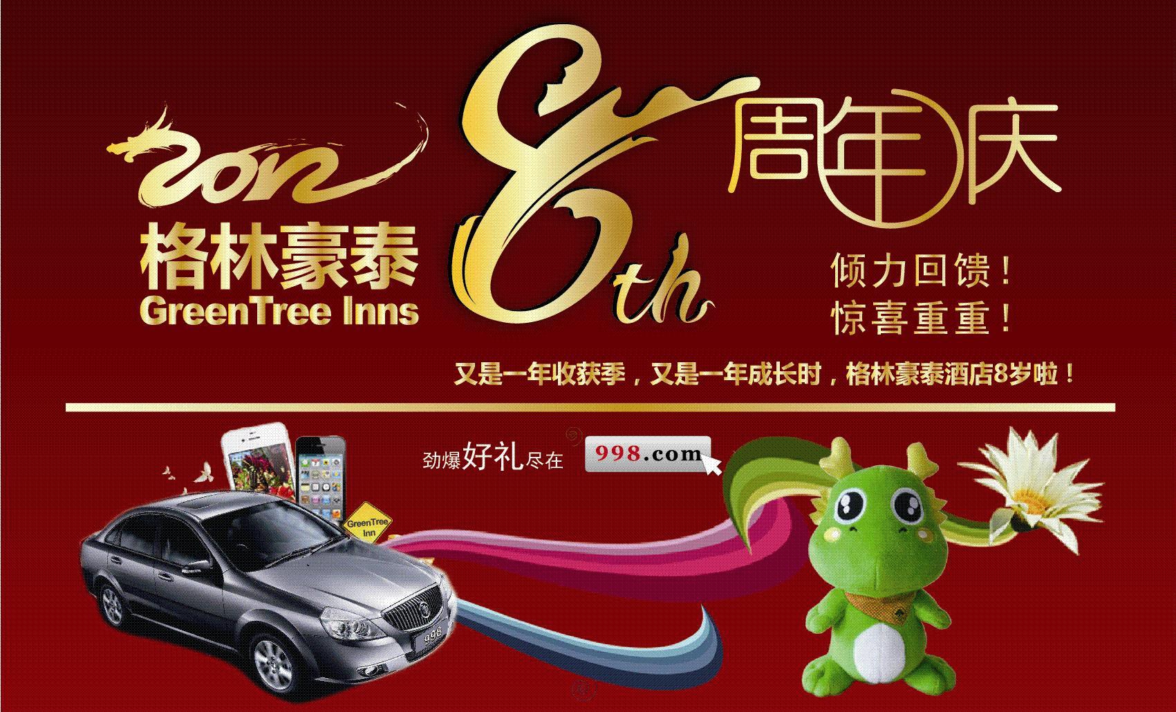上海2013年1月8日電 /美通社/ -- 格林豪泰酒店管理集團(tuán)(以下簡稱“格林豪泰”)慶祝公司成立八周年,為感謝廣大客人多年來的關(guān)注與支持,推出“百萬豪禮感恩反饋”活動(dòng),最后特等獎(jiǎng) -- 價(jià)值十萬余元的轎車將于2013年1月份擇日抽取。