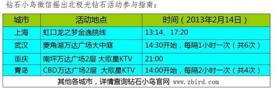 他透露,2月14日當(dāng)天只要在所在城市指定的地點(diǎn)參與鉆石小鳥(niǎo)微信搖一搖活動(dòng)便可獲贈(zèng)鉆石小鳥(niǎo)北極光鉆石及其他精美禮品,為此,鉆石小鳥(niǎo)特別設(shè)置開(kāi)通了“鉆石小鳥(niǎo)北極光”這一官方微信號(hào),只要在活動(dòng)現(xiàn)場(chǎng)通過(guò)微信搖動(dòng)手機(jī),添加加這一官方微信號(hào)并成功打招呼,便有了獲得禮品的資格。