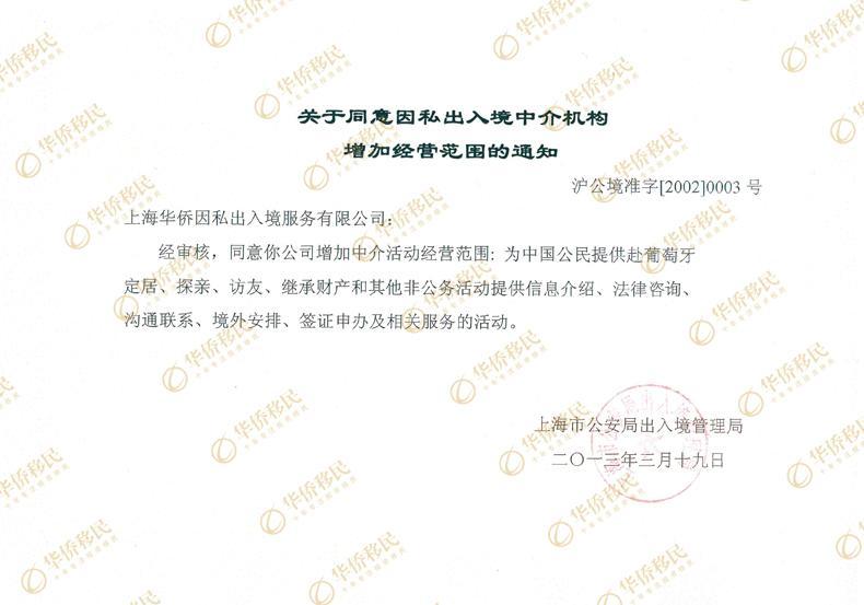 2012年年底,華僑移民正式地向相關部門提出申請,批文的重點就是增加新出臺的葡萄牙移民項目經(jīng)營。上海市公安局出入境管理局受理并對華僑移民做了嚴格的考核。華僑移民的企業(yè)資質,華僑移民葡萄牙境外合作機構、葡方項目方資質、資格、品質等等都是考核的重要內(nèi)容。