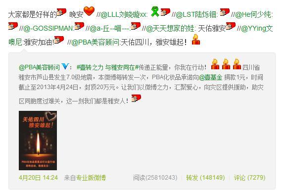微博愛(ài)心籌款活動(dòng)推出僅16小時(shí)轉(zhuǎn)發(fā)人數(shù)即已超過(guò)12萬(wàn)人次,得到了網(wǎng)友的大力支持,抗震救災(zāi)刻不容緩,PBA化妝品當(dāng)即果斷決定提前代表所有支持愛(ài)心籌款活動(dòng)的網(wǎng)友和全體PBA會(huì)員捐出善款。