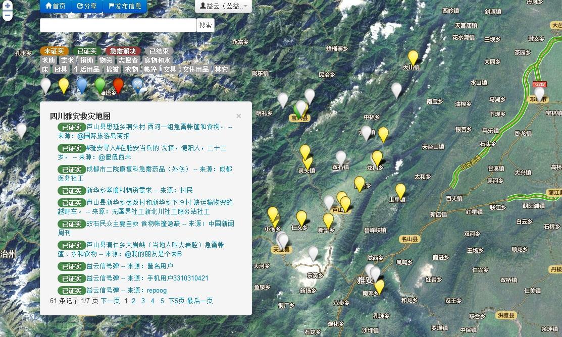 在雅安7.0 級(jí)大地震的震后救援中,在有限的對(duì)外通訊過(guò)程中無(wú)法即時(shí)有效的傳達(dá)救助信息,或會(huì)使災(zāi)區(qū)面臨救援及求援等信息無(wú)法完整、有效地傳遞到災(zāi)區(qū)之外,益云雅安地震救災(zāi)地圖方便災(zāi)區(qū)及外界對(duì)于災(zāi)區(qū)救援/求援信息的傳達(dá)、確認(rèn)及消息確認(rèn)后的及時(shí)響應(yīng)行。