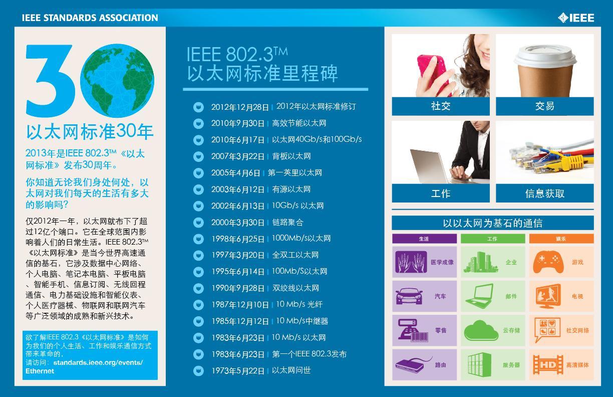 美國皮斯卡塔韋2013年6月27日電 /美通社/ -- 今日,致力于技術發(fā)展和造福人類的世界較大專業(yè)技術協(xié)會IEEE紀念IEEE 802.3?《以太網(wǎng)標準》發(fā)布30周年。IEEE 802.3是當今世界高速通信的基石,它于1983年6月23日獲得首次通過,之后持續(xù)發(fā)布最新的功能和特點以滿足日新月異的市場需求。