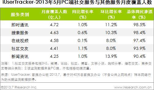 2013年5月社區(qū)交友類服務網民滲透率超過90%,平穩(wěn)增長