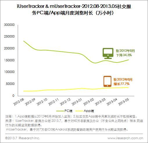 社交類服務流量在PC端和App端表現(xiàn)各異,移動端流量增長迅速。2013年5月與2012年8月相比,App端月度瀏覽時長上升77.7%,PC端則下降34.3%,App端流量增長明顯。艾瑞分析認為,社區(qū)交友類服務在移動端發(fā)展更加強勁,社交類App對用戶時間的分流日漸明顯。
