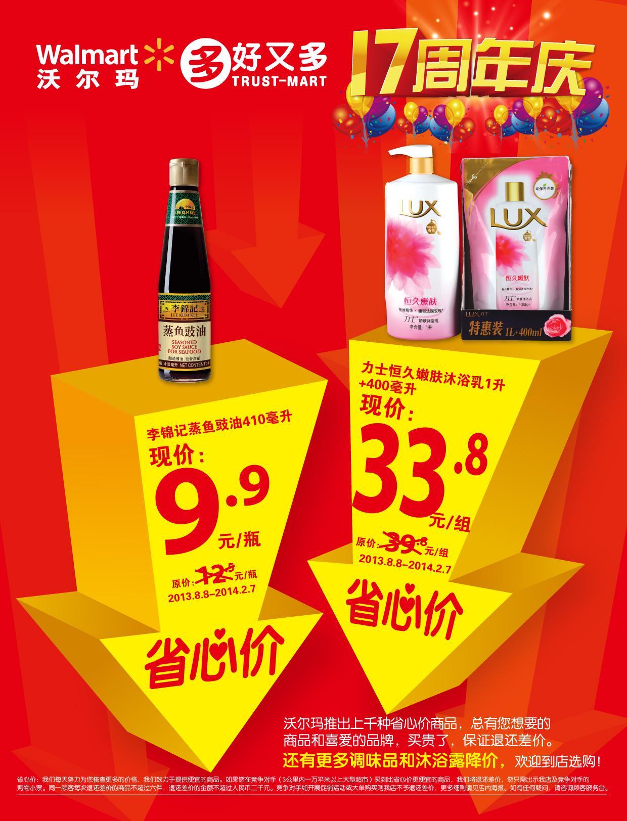 中國深圳2013年8月8日電 /美通社/ -- 今天,沃爾瑪再推特別“省心價”商品:力士恒久嫩膚沐浴乳(1升+400毫升)和李錦記蒸魚豉油(410毫升)。這兩款商品的零售價格分別是:33.8元和9.9元,降價幅度分別達(dá)15%和20%,且價格有效期長達(dá)半年至2014年2月7日。這已是沃爾瑪今年第三次推出特別“省心價”商品。