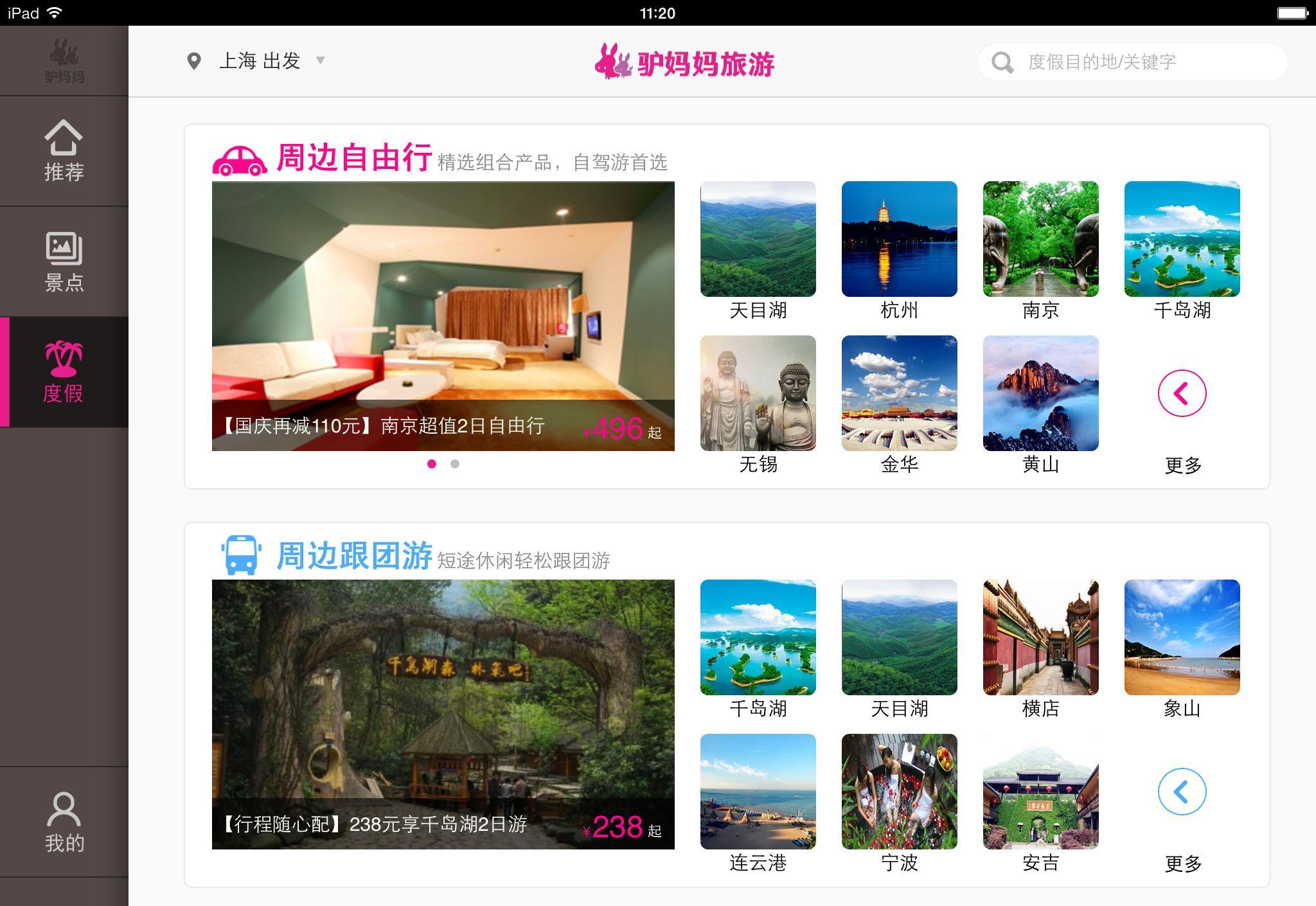 全新驢媽媽iPad版客戶端提供了基于門票、周邊自由行、周邊跟團(tuán)游、長(zhǎng)途游、出境游等多種類型產(chǎn)品的訂購(gòu)服務(wù)。為方便用戶查找出游目的地,客戶端還開發(fā)了超實(shí)用的目的地搜索功能,用戶可通過(guò)頻道頁(yè)面右上方點(diǎn)選“景點(diǎn)/目的地”、“度假/目的地”,根據(jù)各自出游目的地搜索到相關(guān)產(chǎn)品進(jìn)行預(yù)訂。