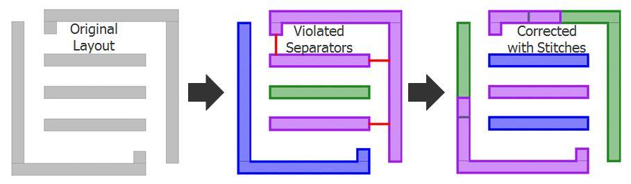 由于這個(gè)工藝類似于 20/16/14nm雙重曝光工藝,設(shè)計(jì)師可能會(huì)發(fā)現(xiàn)很多類似之處,這會(huì)使轉(zhuǎn)變到三重曝光工藝更容易。即使是使用縫合這樣的固定解決方案,對(duì)于這個(gè)工藝而言理論上也是可行的。圖4顯示了一個(gè)版圖示例,這個(gè)版圖在三個(gè)光罩中不能自然分解,但可以通過利用縫合成功分解。